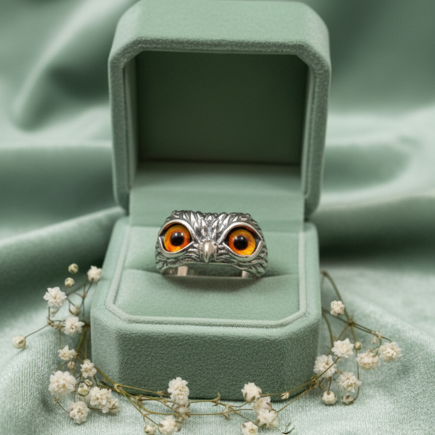A truly captivating piece of wearable art. This majestic Sterling Silver owl ring boasts intricate detailing and piercing amber-hued gemstone eyes. A striking accessory that elevates any collection.