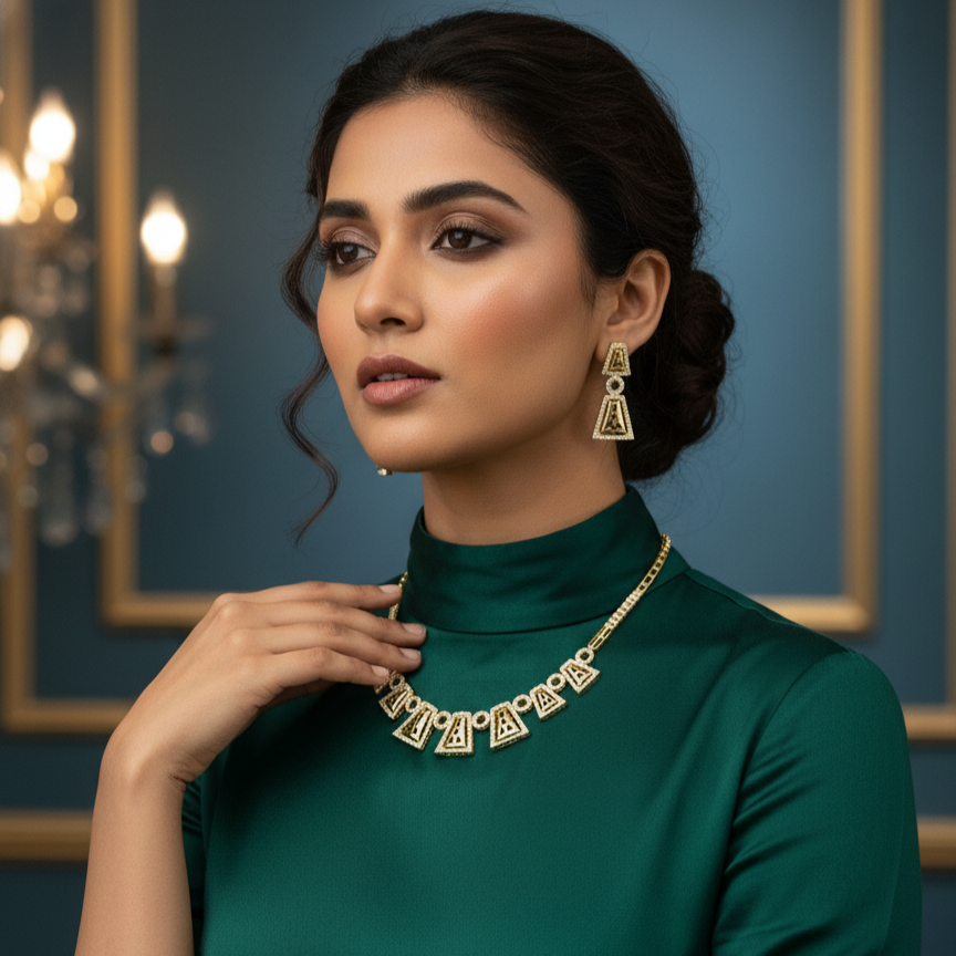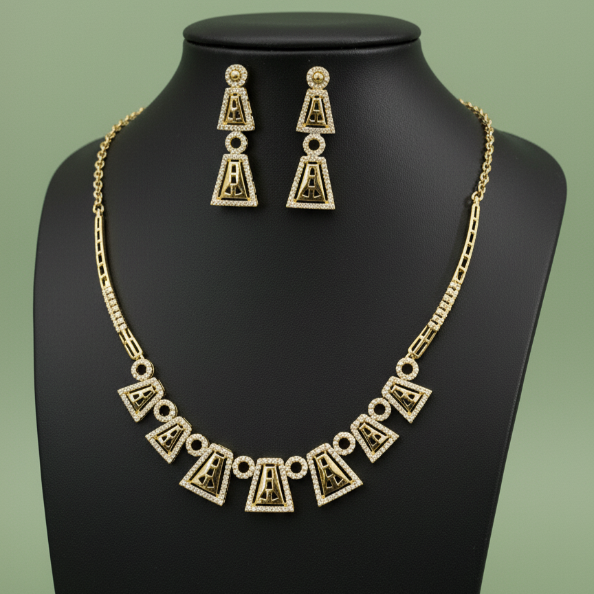 An eye-catching necklace and earring set with a distinct geometric, Art Deco-inspired design. Sparkling stones highlight the intricate openwork, all crafted from beautiful 925 sterling silver with a gold finish.