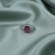 A bold, sculptural silver ring featuring a hand-set pavé textured surface that mimics a delicate petal. At its heart sits a deep crimson oval ruby, creating a stunning focal point.