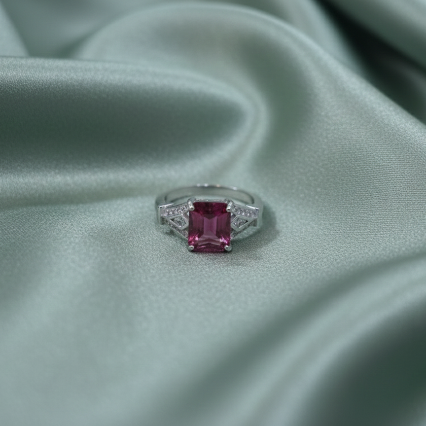 Inspired by vintage glamour, this silver ring showcases a magnificent emerald-cut pink topaz. The geometric shoulders are intricately set with accent stones for a refined, architectural look.