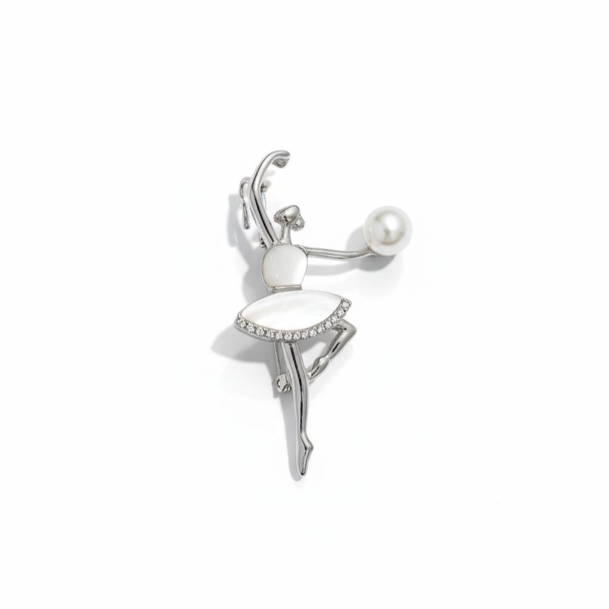 Capture the art of dance with this elegant ballerina brooch. Rendered in polished 925 sterling silver, she features a luminous mother-of-pearl tutu edged with glittering stones and holds a single, lustrous pearl in a graceful pose.