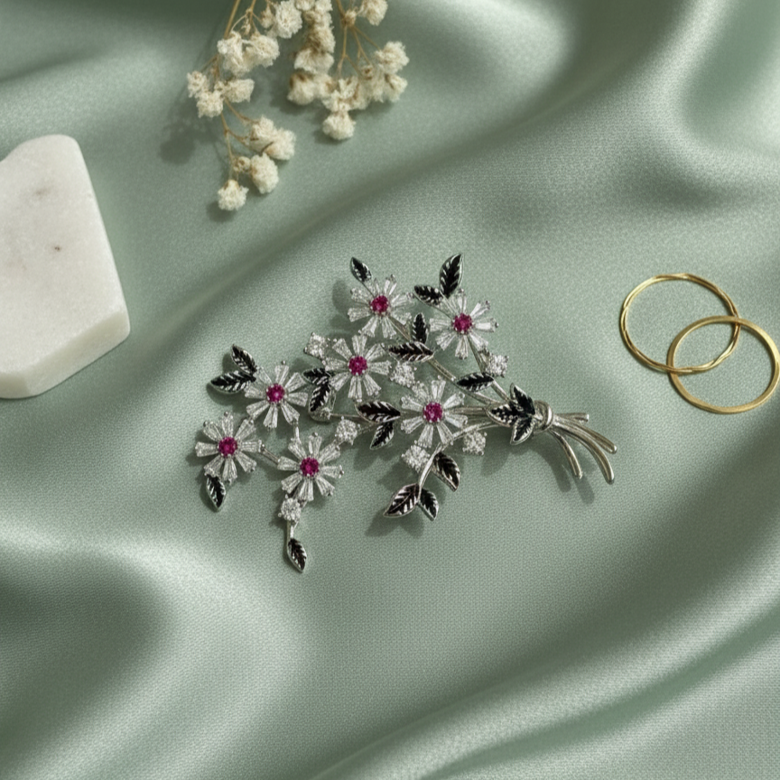 An exquisite floral bouquet, meticulously captured in 925 sterling silver. This intricate piece features vibrant ruby-colored centers, sparkling petals, and elegant black enamel leaves for a timeless statement.